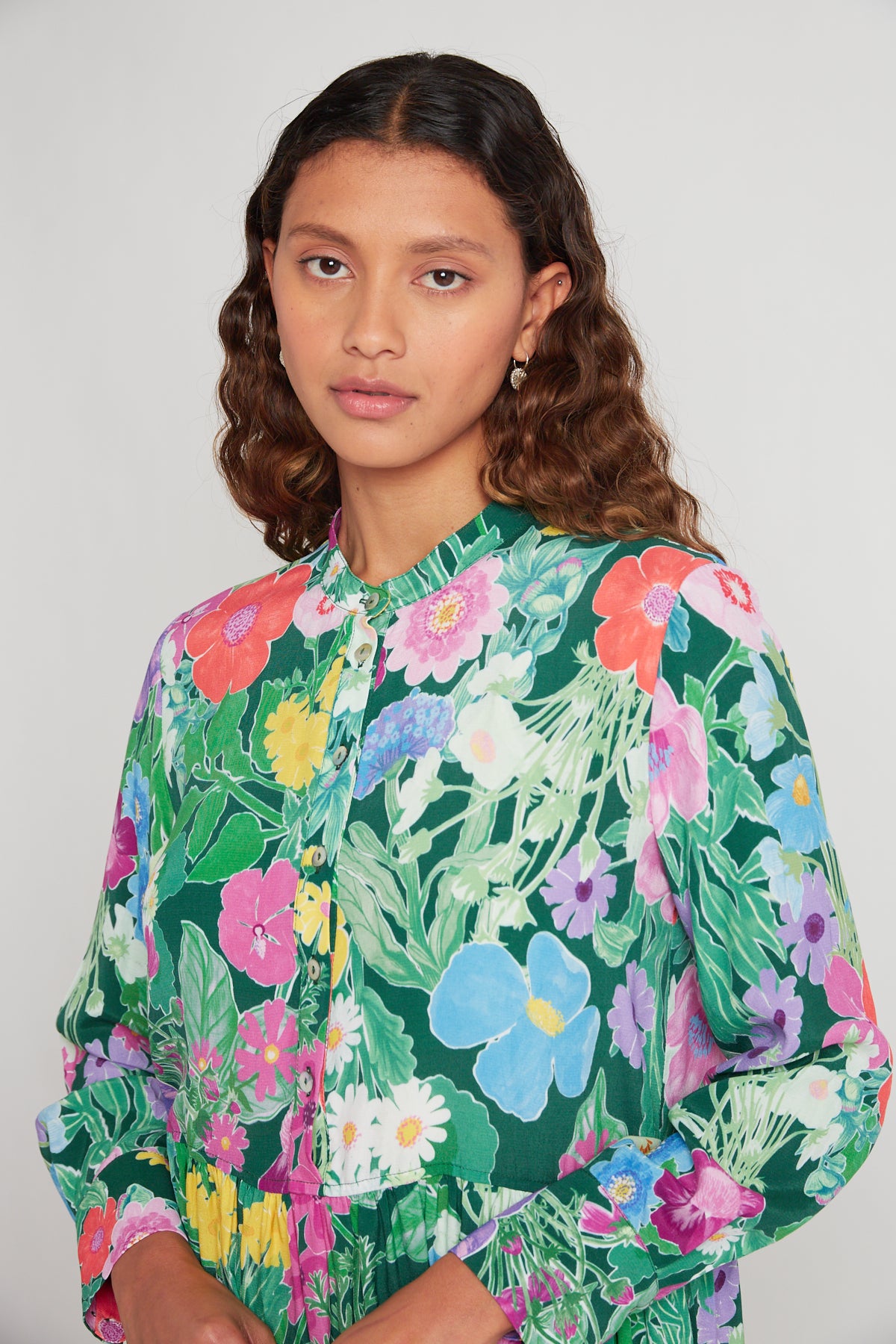 Life is a flower, and everyone loves a garden party. An elegant long-sleeved, collarless shirt dress with front button wrap, and long, gathered skirt. Cut in this season's custom masterpiece floral.